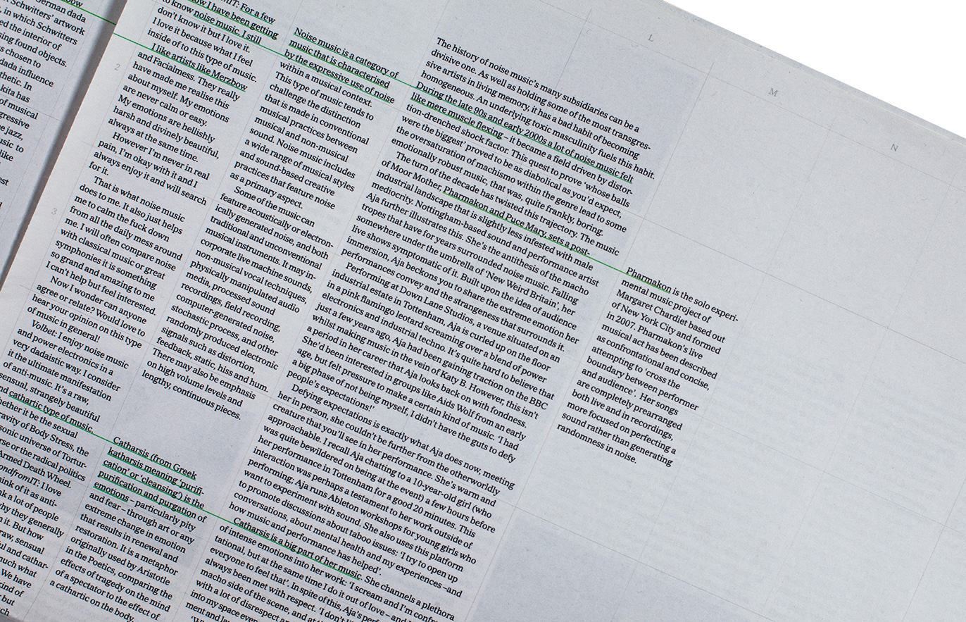 The magazine’s look is heavily inspired by traditional large format newspapers like The New York Times. In contrast, through eliminating headlines and blurring the start- and endpoints of the pieces, the layout allows the reader to move through articles, quotes, forum posts and interviews in a non-hierarchical way.